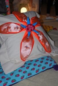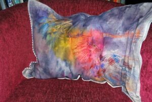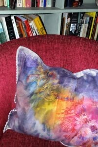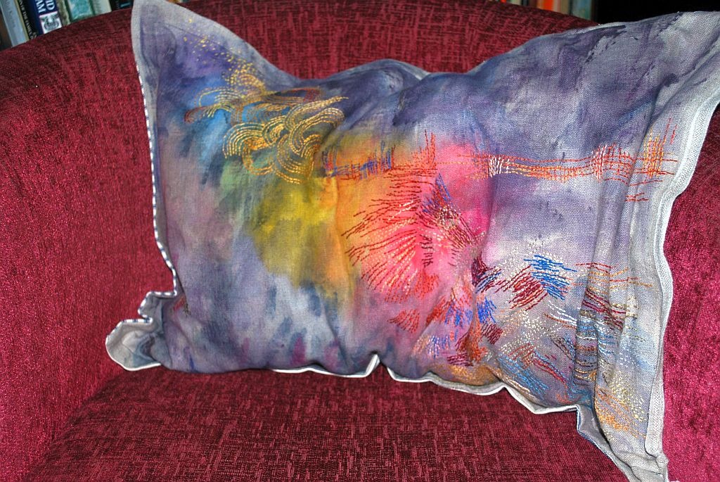 This embroidery has now become a cushion cover. I didn’t use oil paint on this piece so decided it could become a textile response as a cushion cover. I like the idea of people being able to touch the embroidery, and a cover like this lends itself to that notion. It works well as this and is now on a red chair in our living room. The soft pre-washed Lithuanian linen is ideal for soft furnishings and I really enjoyed working with it. I never know if a piece wants to become a mixed media painting or textile response until quite late in the making process, and just remain open to wherever it may take me. I was inspired by some applique cushions I saw at Blackburn cathedral Textiles Biennale last week but have already been making cushions with flanges. It must be in the air! The nomads tent at the Biennale was stunning. Here is one of the cushions