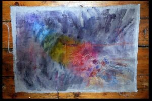 Well, have added more Pebeo dyes to this current piece and have turned a bit of a corner I think. I was coming to a natural pause with the hand stitch and needed something different. I love how the dyes can take you in a new direction. I stretched the linen on a board and wet it and then mixed some dyes. I always like the purply greys you can get with tertiary colours so went for that. It’s hard with the linen because it goes so dark when you wet it so you are working in the dark. That adds to the fun and makes you more inclined to take risks I think. I like the effect now that it is dry and am going back in with the hand stitch that is meditative and slow .Click  to  enlarge.